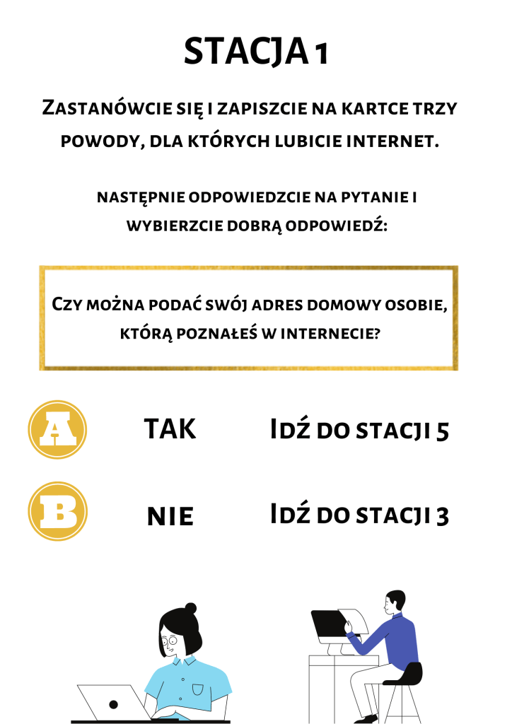 Dzielimy klasę na zespoły, każda grupa startuje z innej stacji. Celem tej zabawy jest odwiedzenie wszystkich stacji i wykonanie poniższych zadań. Poprawne odpowiedzi będą kierowały nas do poprawnych stacji. Jeśli uczniowie się pomylą, nie odwiedzą wszystkich 6 stacji.