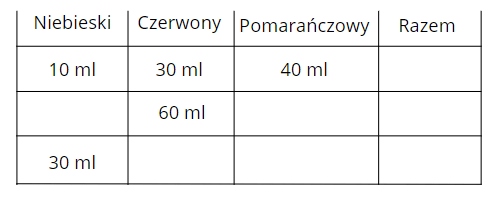Jeśli wlalibyśmy 30 ml niebieskiego, ile należałoby dodać czerwonego i pomarańczowego?