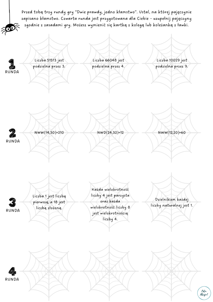 Czwarta runda zawiera puste pajęczyny – uczniowie mogą uzupełnić pola zgodnie z zasadami gry, czyli muszą wpisać dwa zdania zawierające prawdziwe informacje oraz jedno zdanie zawierające kłamstwo. Po uzupełnieniu pajęczyn, uczniowie wymieniają się kartkami lub odczytują swoje zdania, a pozostali muszą odgadnąć, gdzie znajduje się kłamstwo. 🙂