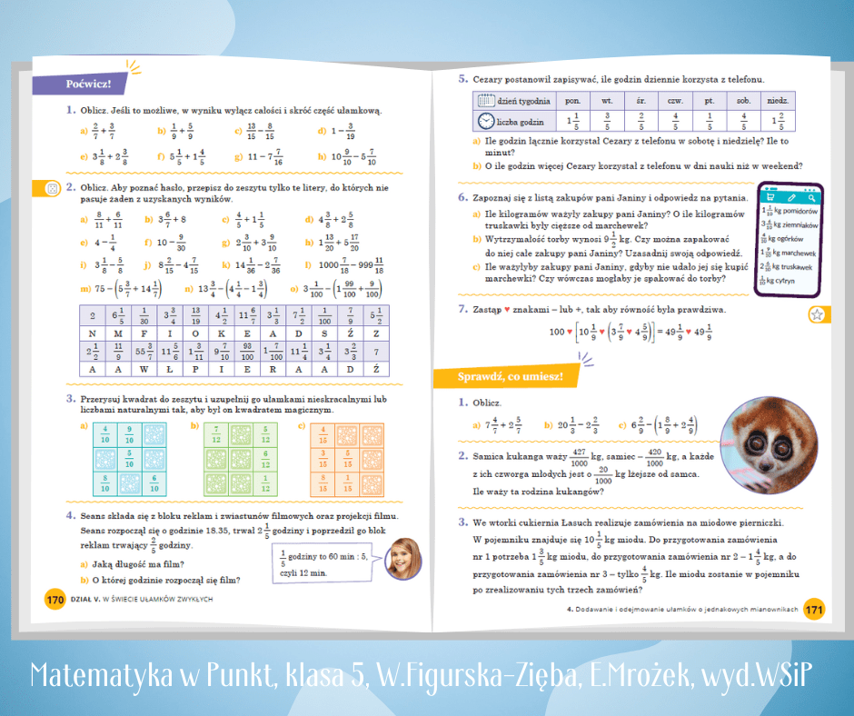 Przede wszystkim – z podręcznika, z którego korzystamy na co dzień! Przed zajęciami wybierz zadania, które będą realizowały cele Twojej lekcji. W podręczniku „Matematyka w Punkt” wyd. WSiP, którego jestem współautorką, są już ułożone zgodnie z zasadą stopniowania trudności. Korzystając z elektronicznej wersji podręcznika, w bardzo łatwy sposób możesz „wyciąć” te, które mają być w puli zadań do wyboru. Zauważ, że są zróżnicowane również pod względem tematycznym.