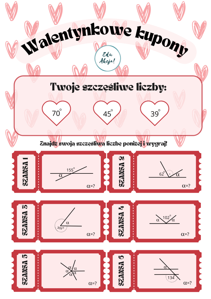 Przygotowałam 6 wersji kuponów – na każdej z nich znajdują się inne szczęśliwe liczby. Zadaniem uczniów jest ustalić miary kątów alfa, które znajdują się na polach „SZANSA”. Jeśli posiadacie taśmę do zdrapek, to warto zakleić pola „Twoje szczęśliwe liczby”, aby uczniowie mogli je zdrapać. Nie jest to jednak konieczne.