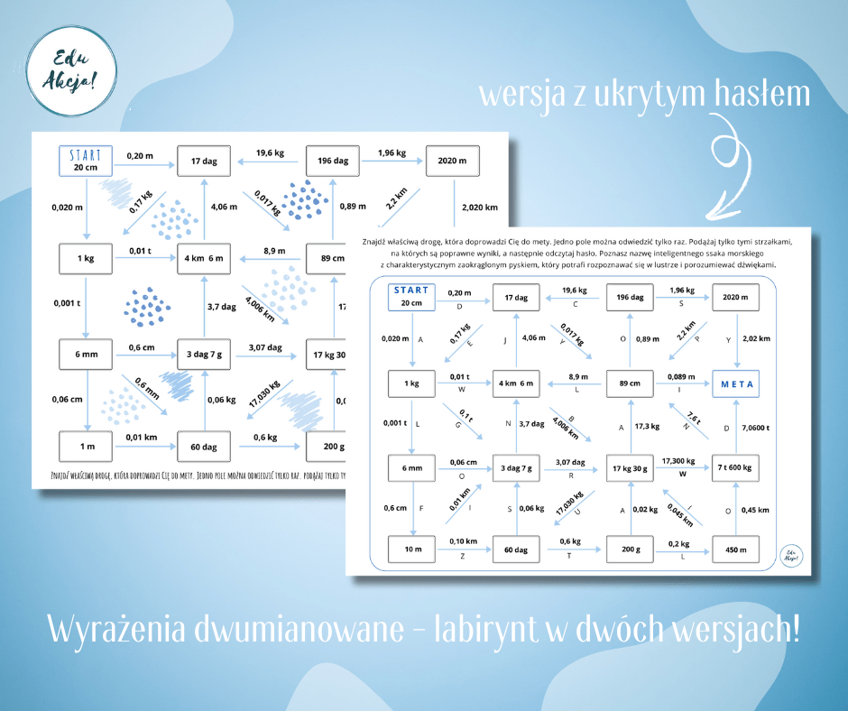 W swoich zasobach znalazłam labirynt, który przygotowałam 5 lat temu na lekcję dotyczącą wyrażeń dwumianowanych. Nie wiem jak jest u Was, ale moi uczniowie nigdy nie przepadali za tym tematem. Labirynt powstał, aby nieco umilić im ćwiczenie odpowiednich zapisów.