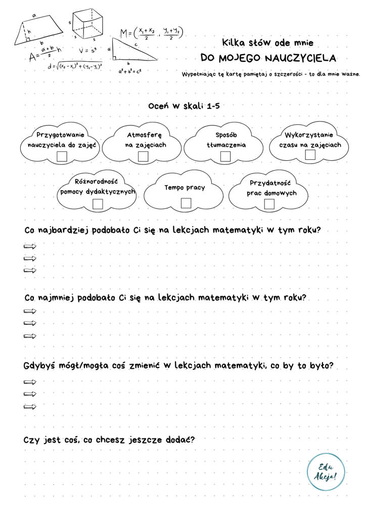 W tym roku do refleksji uczniowskiej dorzucam jeszcze jeden element – ocenę lekcji. Z pozoru odważny krok, ale myślę, że bardzo potrzebny. Nie jako test, nie jako sąd nad nauczycielem, ale jako zaproszenie do rozmowy o tym, co działało i co warto zmienić.