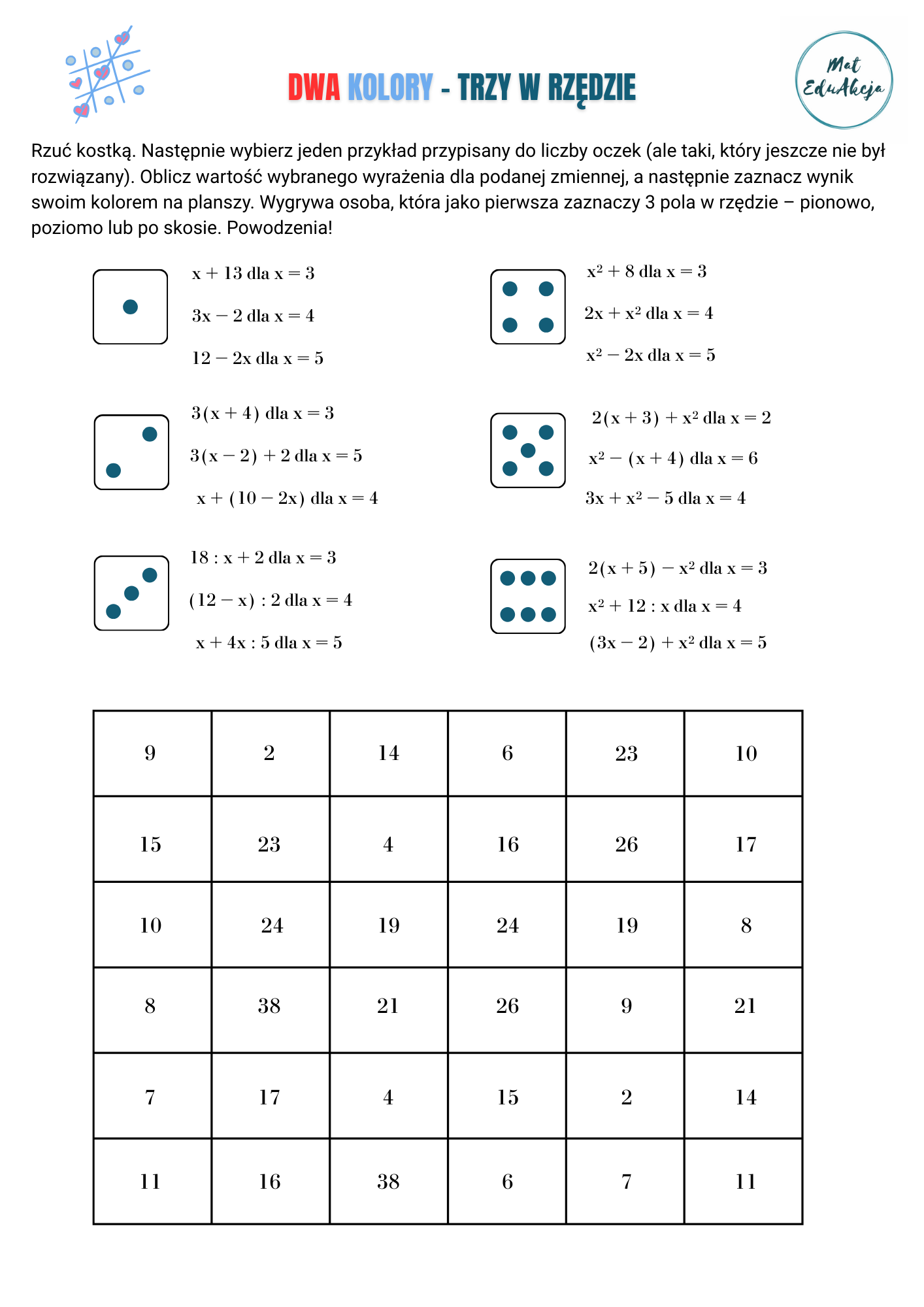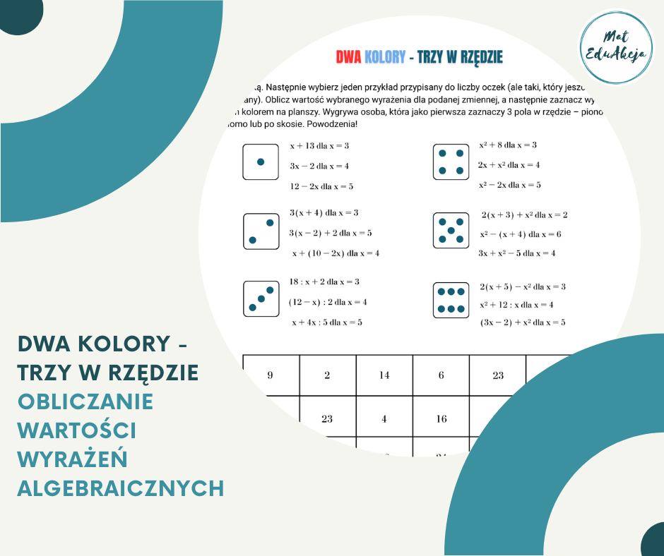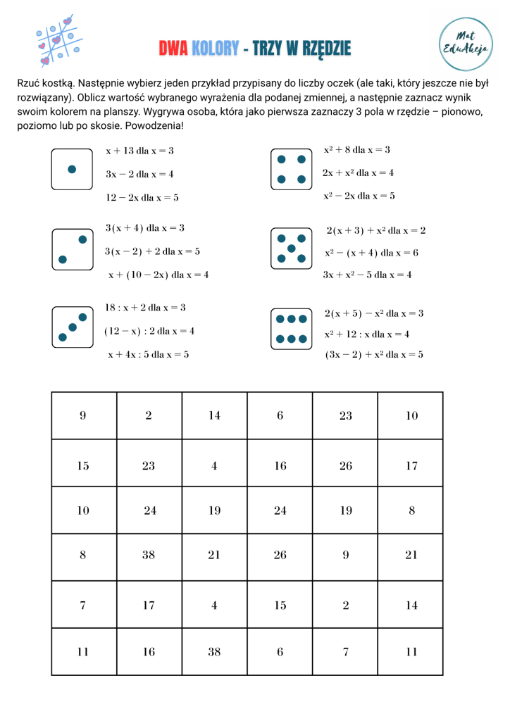 Poprzednia gra, którą przygotowałam bardzo Wam się spodobała! Wykorzystałam ją zarówno na warsztatach, jak i zajęciach indywidualnych w ramach „przełamania lodów”. Sprawdziła się świetnie, dlatego stworzyłam jej kolejną odsłonę, którą możecie wykorzystać w klasach 6,7,8 przy realizacji tematów związanych z wyrażeniami algebraicznymi, a konkretniej z tematem „Obliczanie wartości wyrażeń algebraicznych”.